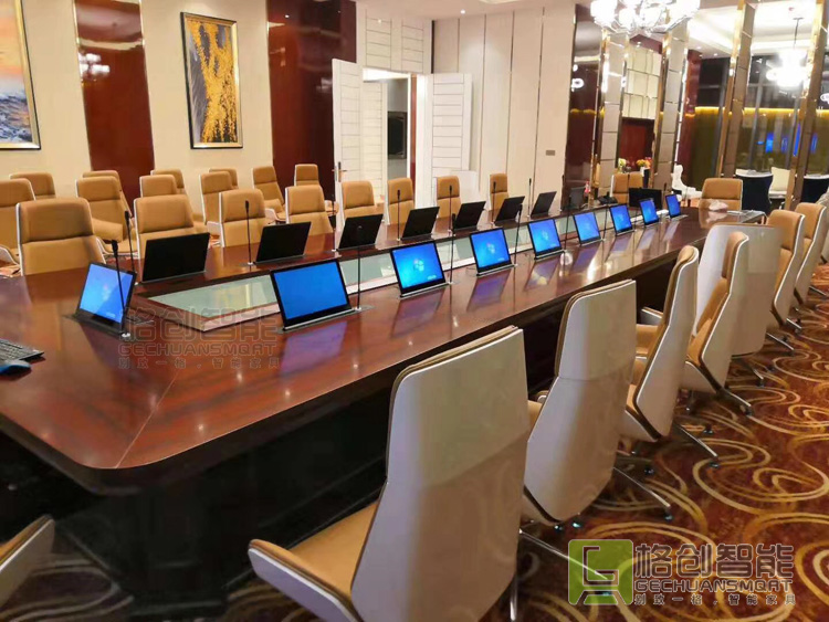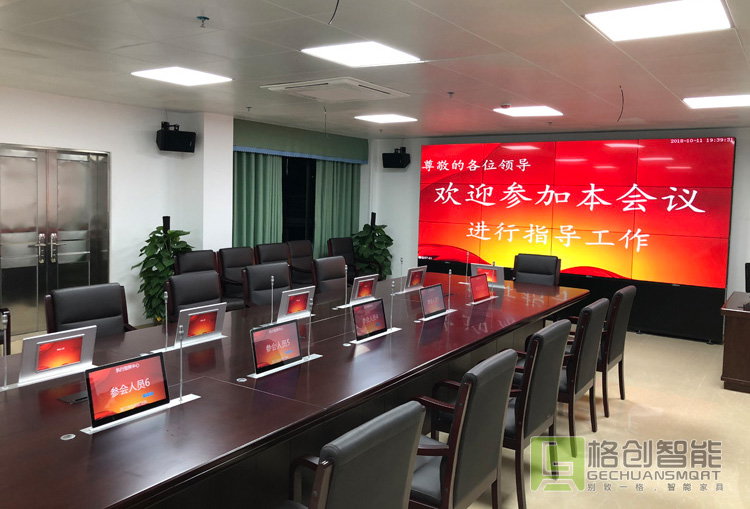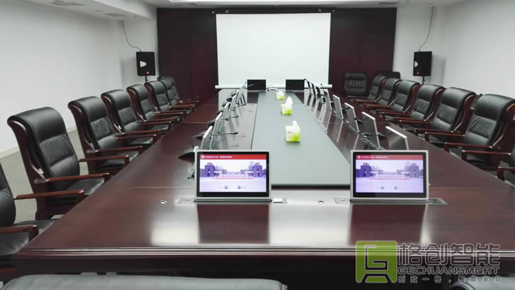 | 根據(jù)該院實(shí)際需求,格創(chuàng)智能為他們的會議室設(shè)計(jì)了一套無紙化會議系統(tǒng)解決方案,來滿足該院的日常工作會議、視頻會議、保密會議、研討會議等適合多種會議形式的智能會議室。會議終端采用高清超薄液晶觸控屏,單屏帶話筒一鍵或獨(dú)立升降控制,嵌入式安裝方式,使整個(gè)會議桌看起來整潔、美觀。 |