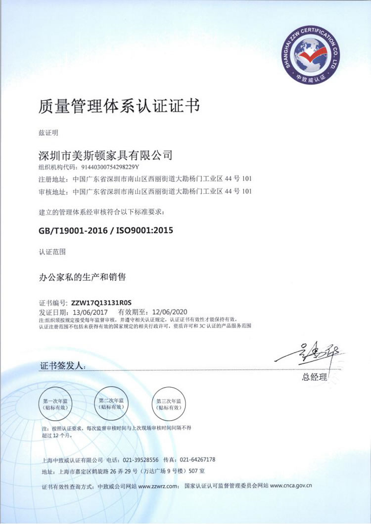 | 當(dāng)前位置:首頁 ? 辦公家具資訊 ? 榮譽(yù)資質(zhì) ? 質(zhì)量管理體系認(rèn)證證書 |